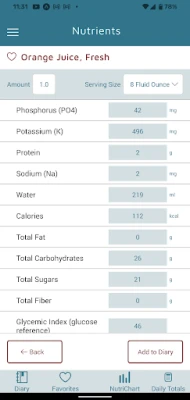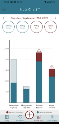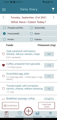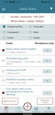 KidneyDiet® melangkaui sekadar penjejakan asas dengan menyediakan pangkalan data makanan berkualiti penyelidikan yang luas dan komprehensif. Anda boleh memperibadikan Garis Panduan Diari Harian anda, membolehkan perbandingan mudah pengambilan nutrisi anda dengan cadangan doktor. Dengan carta dan jadual yang jelas, anda akan mendapat kefahaman mendalam tentang diet anda. Penjejakan nutrien adalah menyeluruh, menunjukkan analisis pengambilan karbohidrat, indeks glisemik, beban glisemik, lemak, kolesterol, vitamin, dan mineral daripada makanan yang anda makan. Tambahan pula, anda boleh menyimpan senarai makanan kegemaran dan menghantar Diari Harian anda terus melalui e-mel kepada diri sendiri atau penyedia penjagaan kesihatan anda untuk semakan mudah.