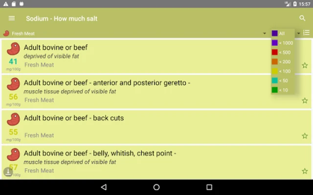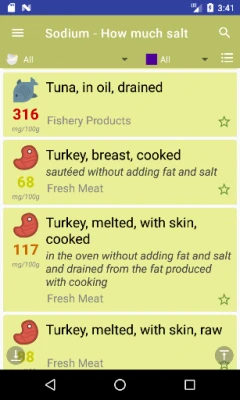 Aplikasi intuitif ini menghilangkan kerumitan pengiraan natrium dengan menyediakan maklumat yang jelas dan mudah difahami. Setiap item makanan dapat dinilai berdasarkan jumlah natrium yang terkandung, ditunjukkan secara tepat dalam miligram per 100 gram produk (mg/100g). Ini membolehkan anda membuat pilihan makanan yang termaklum dengan pantas, tanpa perlu membuat tekaan atau rujukan silang yang memenatkan. Dengan data di hujung jari anda, merancang hidangan yang mematuhi keperluan diet rendah natrium anda menjadi lebih mudah dan kurang membebankan.