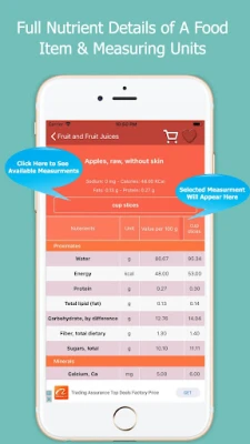 Temukan panduan nutrisi menyeluruh di hujung jari anda. Aplikasi inovatif ini membawa anda ke perpustakaan makanan yang luas, merangkumi lebih 8000 jenis, semuanya dikategorikan dengan teliti mengikut kumpulan makanan. Bayangkan akses tanpa had kepada maklumat makanan lengkap di mana sahaja anda berada, walaupun tanpa sambungan internet, dan yang terbaik, ia percuma sepenuhnya. Setiap entri makanan dilengkapi dengan perincian nutrisi yang mendalam, memberikan anda gambaran jelas tentang apa yang anda makan, termasuk pelbagai pengukuran isi rumah yang praktikal untuk memudahkan pemahaman anda.