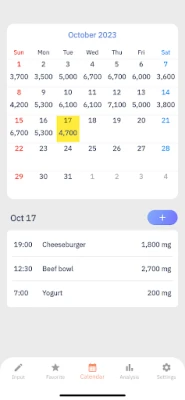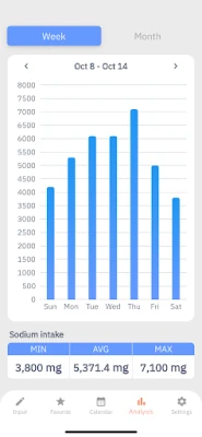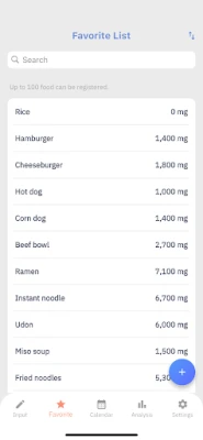 Untuk kemudahan maksimum, anda boleh mendaftarkan makanan kegemaran anda ke dalam "Senarai Kegemaran." Ini membolehkan anda memilih item yang kerap diambil dengan serta-merta pada masa akan datang, menjimatkan masa dan usaha. Lebih daripada sekadar pencatat, skrin "Analisis" aplikasi ini menawarkan gambaran menyeluruh tentang corak pengambilan natrium anda melalui carta mingguan dan bulanan yang jelas. Visualisasi data yang kuat ini merupakan alat yang sangat berguna untuk meninjau dan memperbaiki tabiat pemakanan anda dari semasa ke semasa.